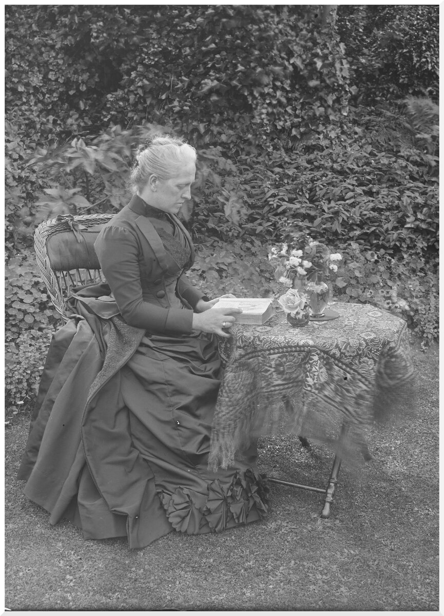 Mother reading at table in garden