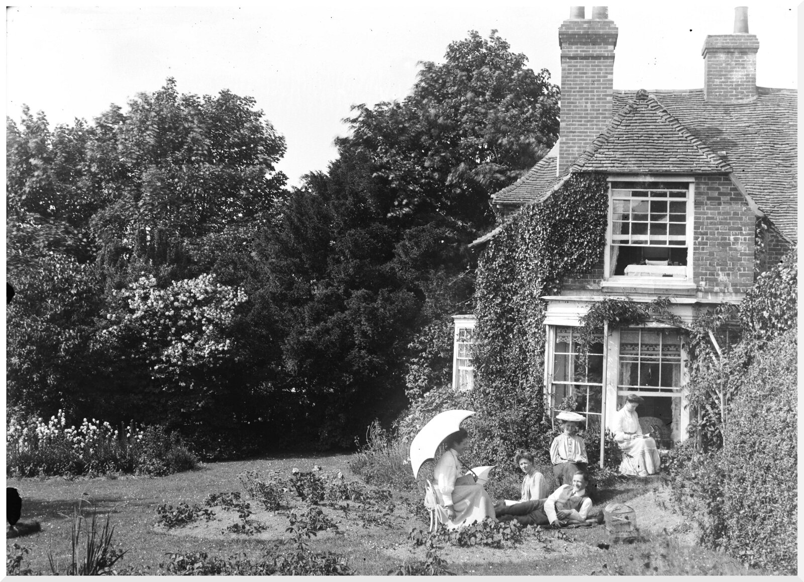 Group having tea on lawn