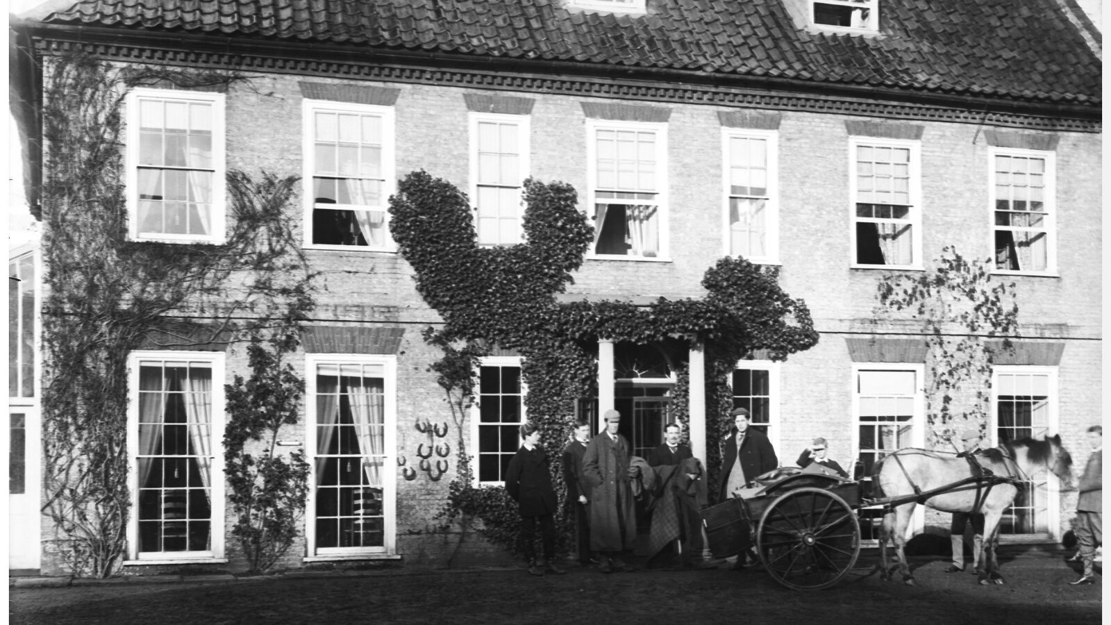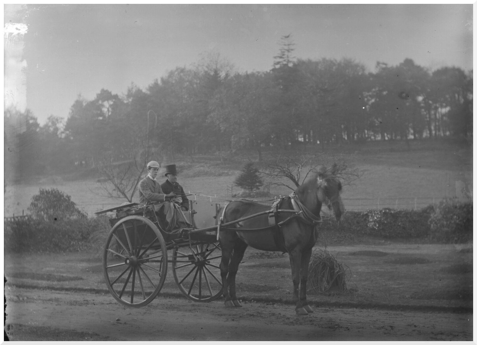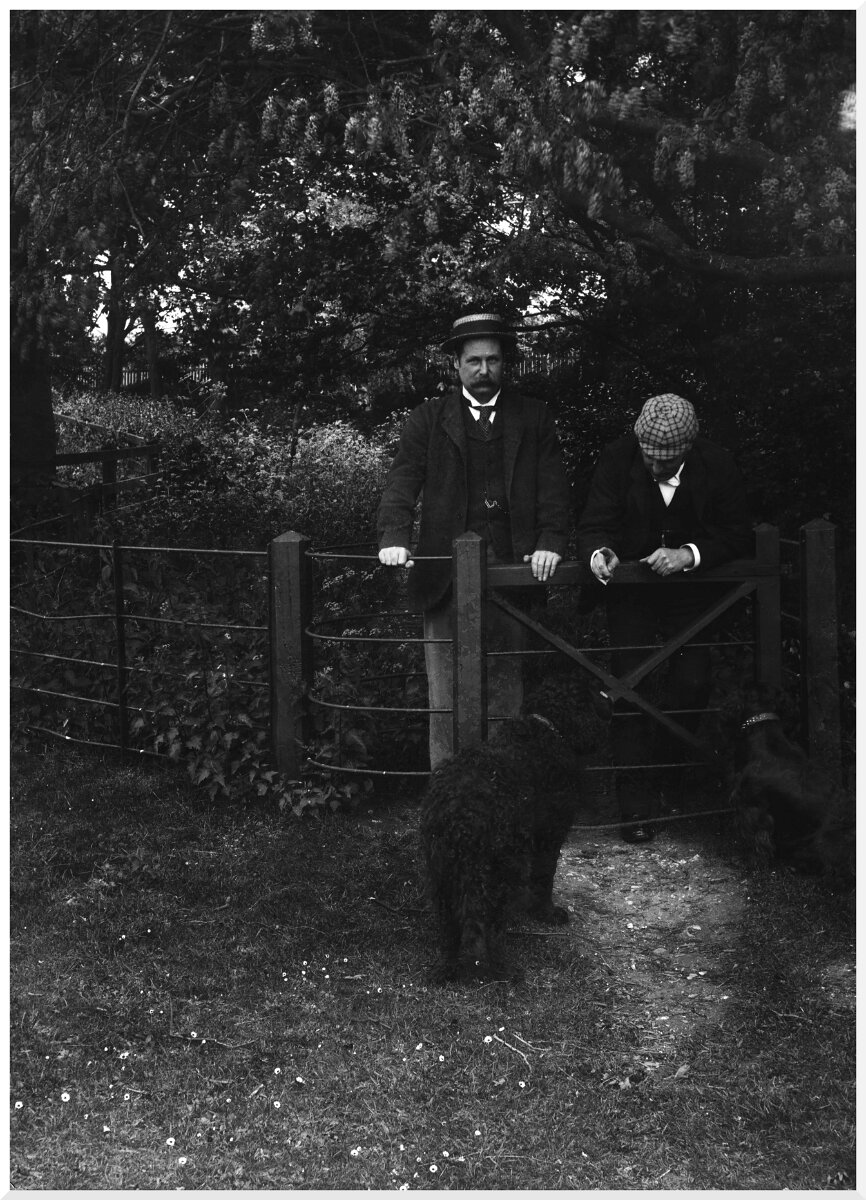 Father and Mr. Long by shrubbery gate
