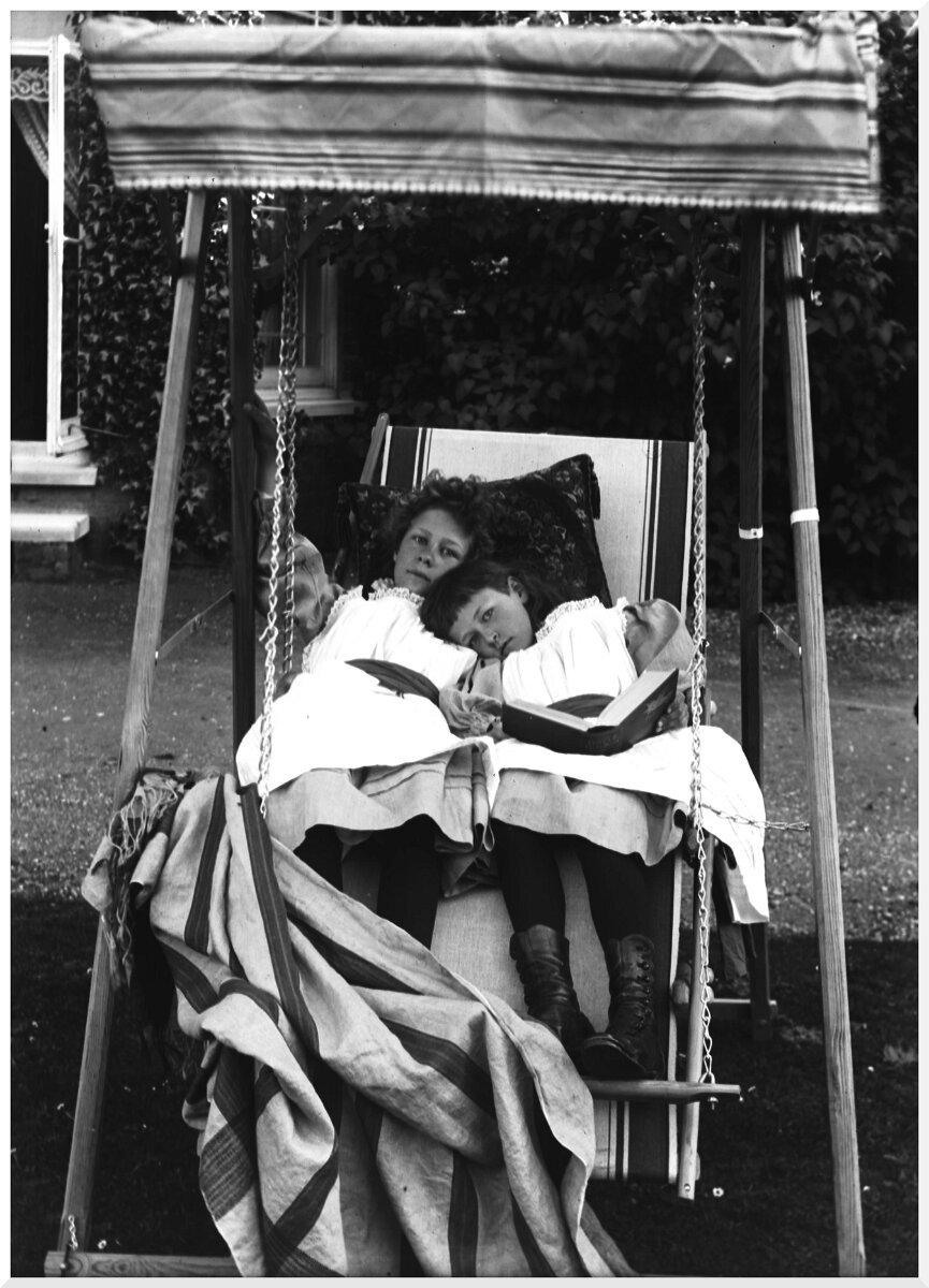 Gertie & Nona in hammock chair, Sedgeford Hall