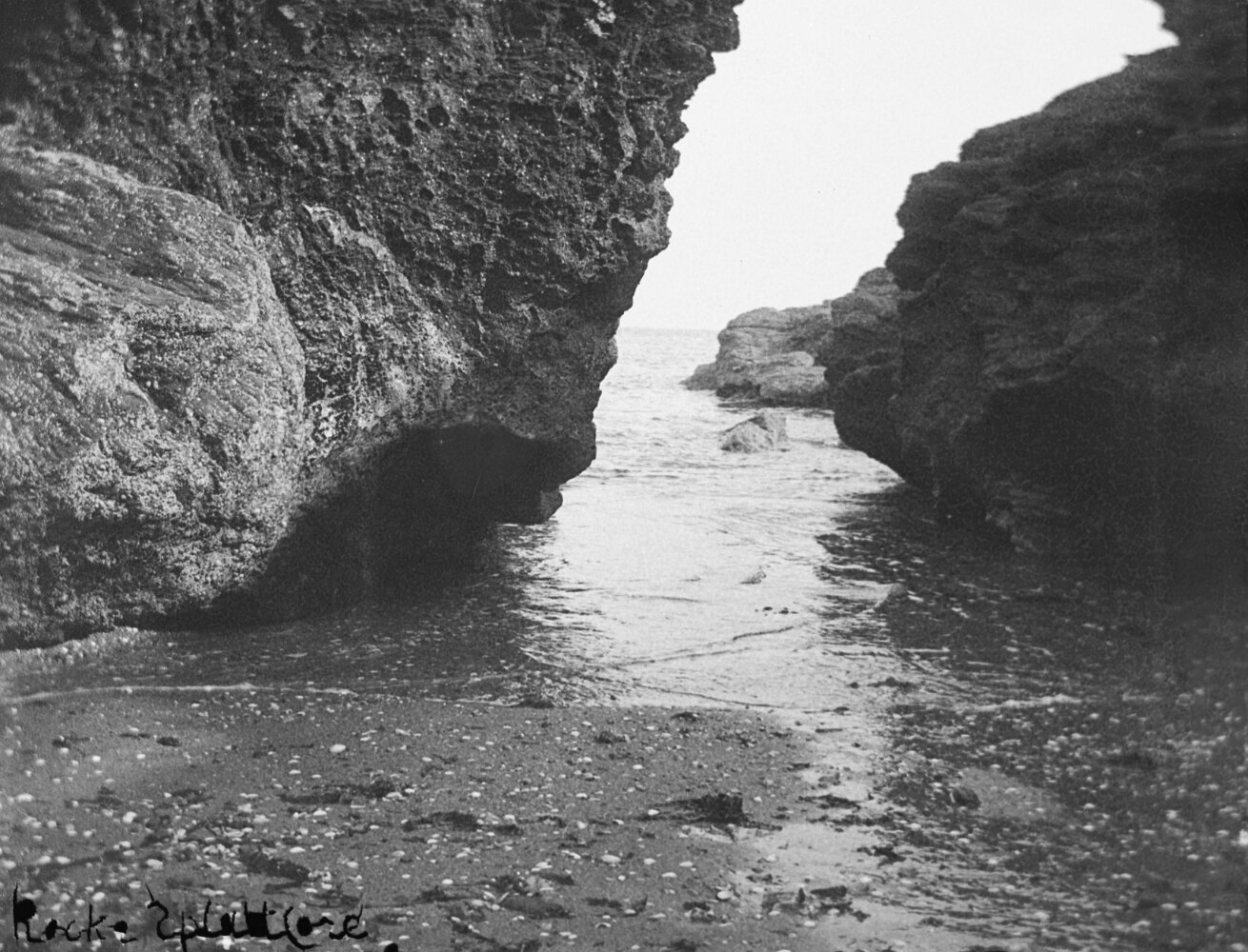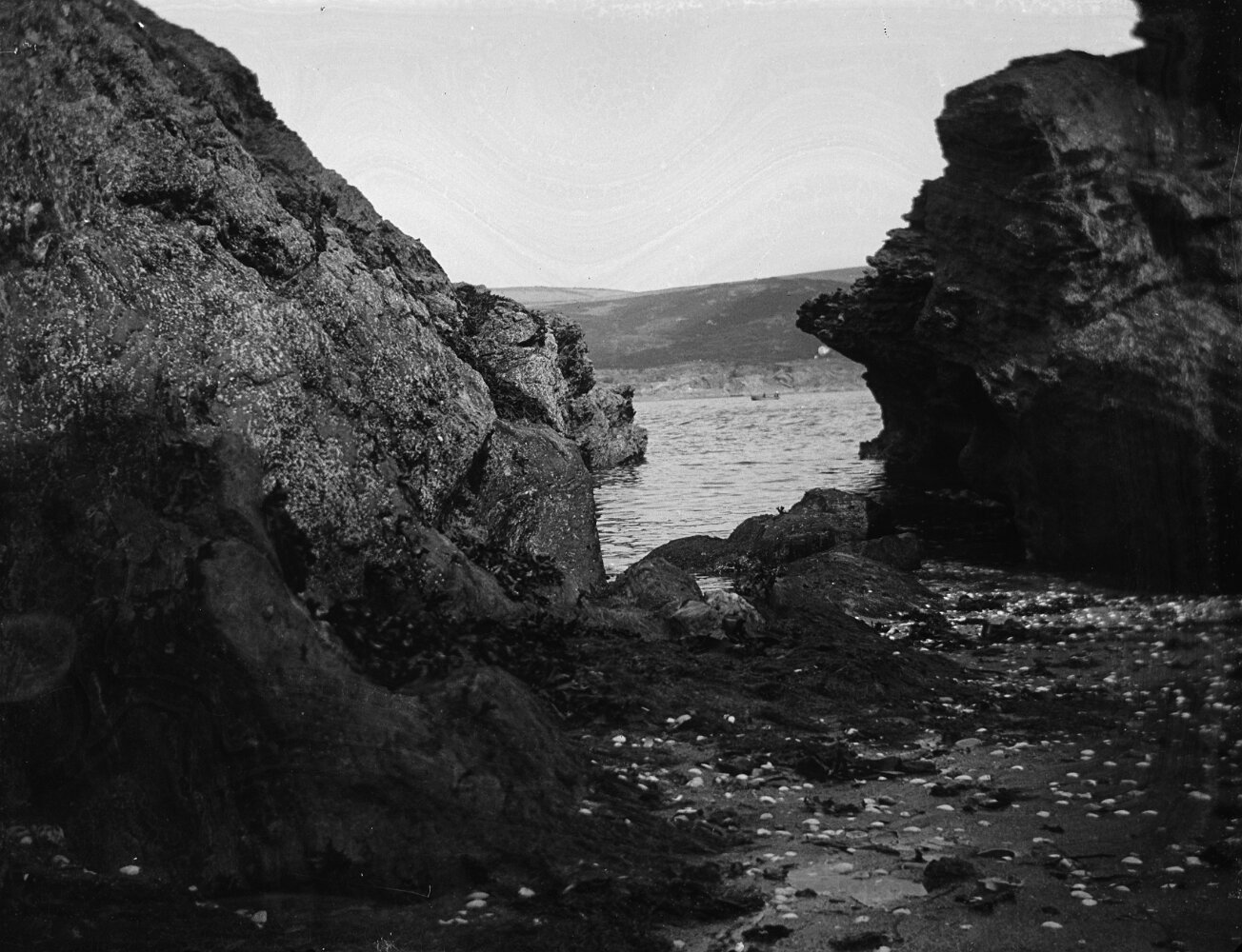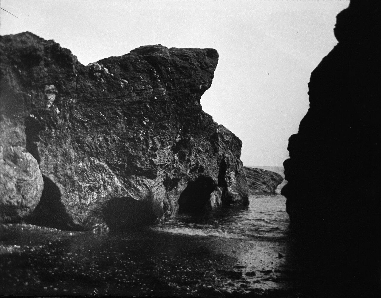 Original caption: Sea seen thr' cleft on rocks