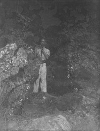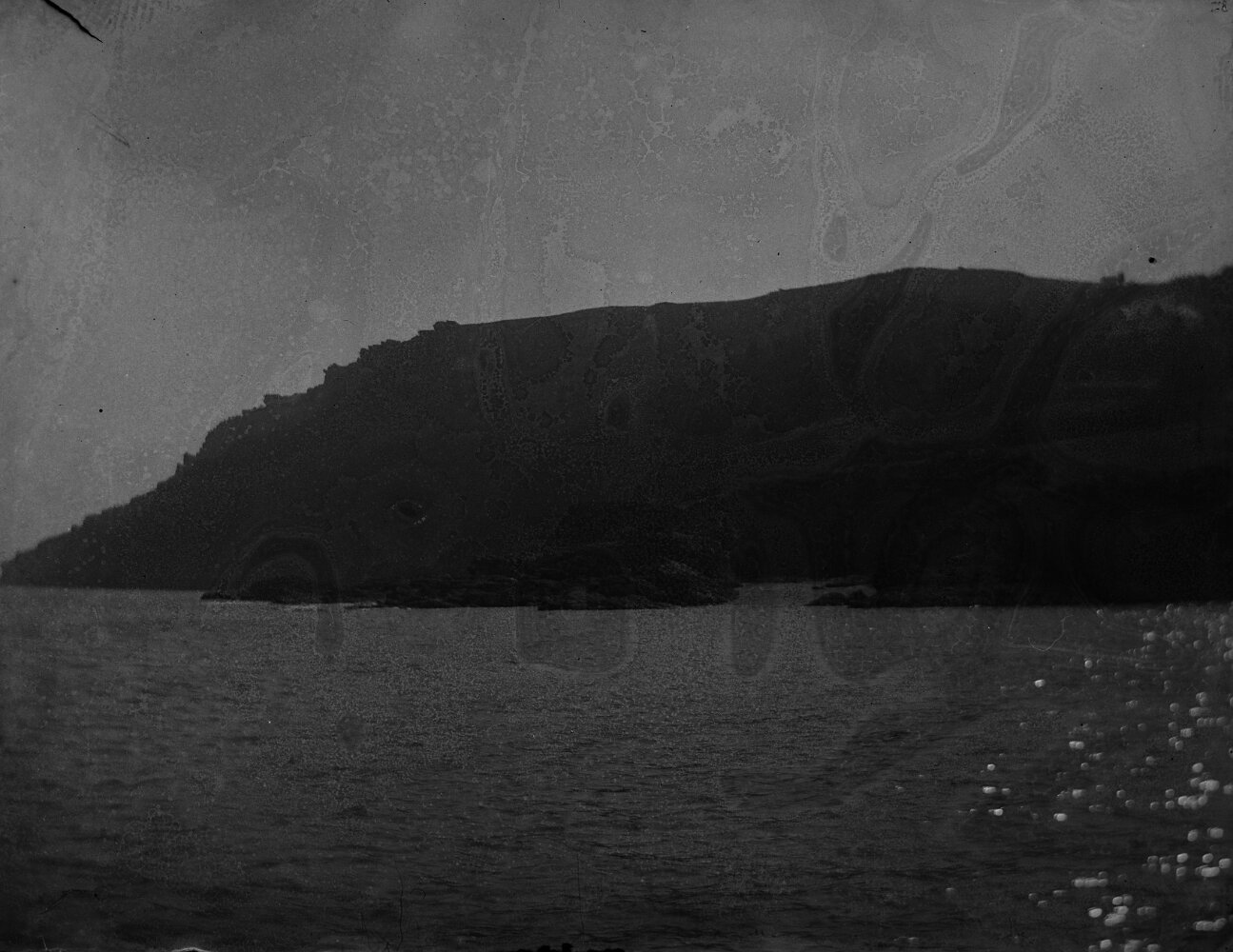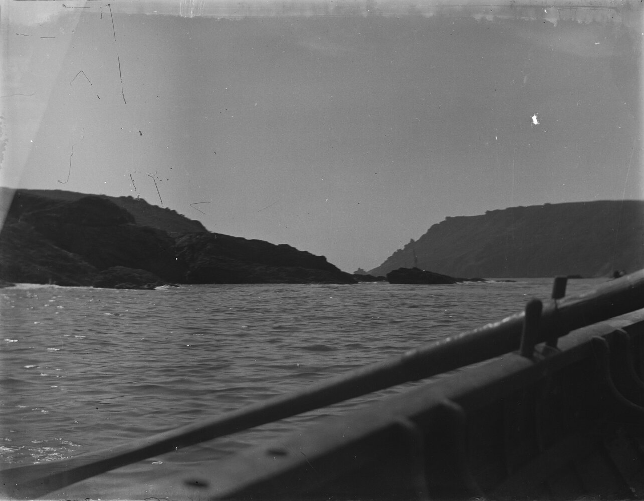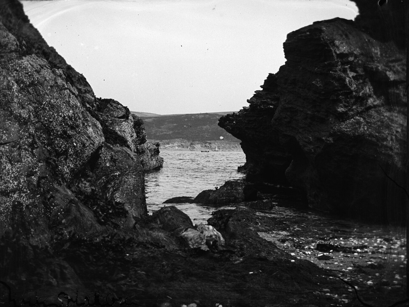 Original caption: Sea seen thr' cleft on rocks
