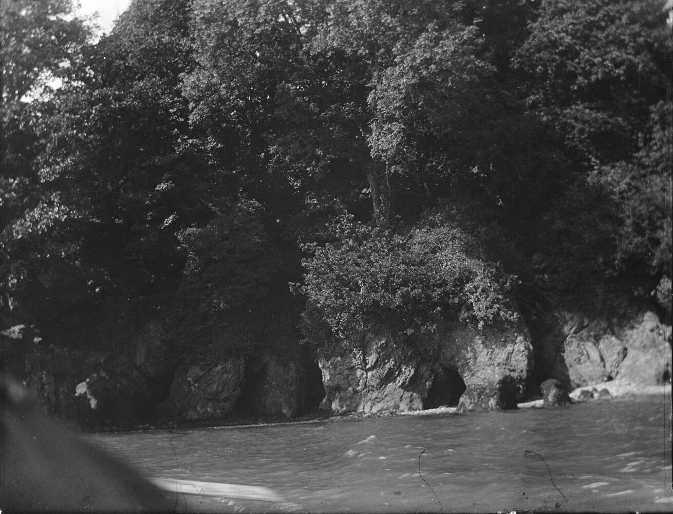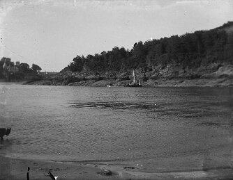 Original caption: View of shore line from boat